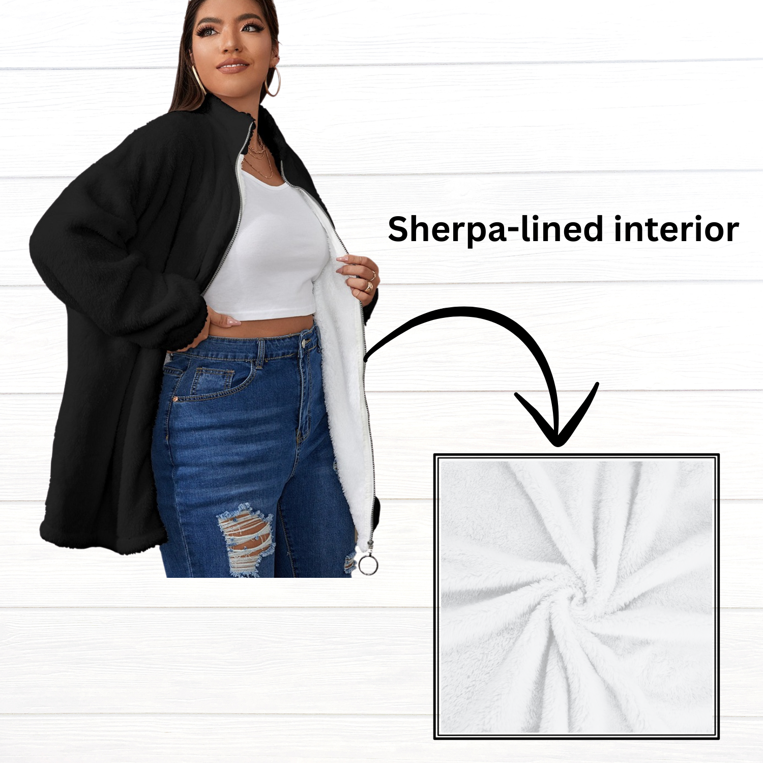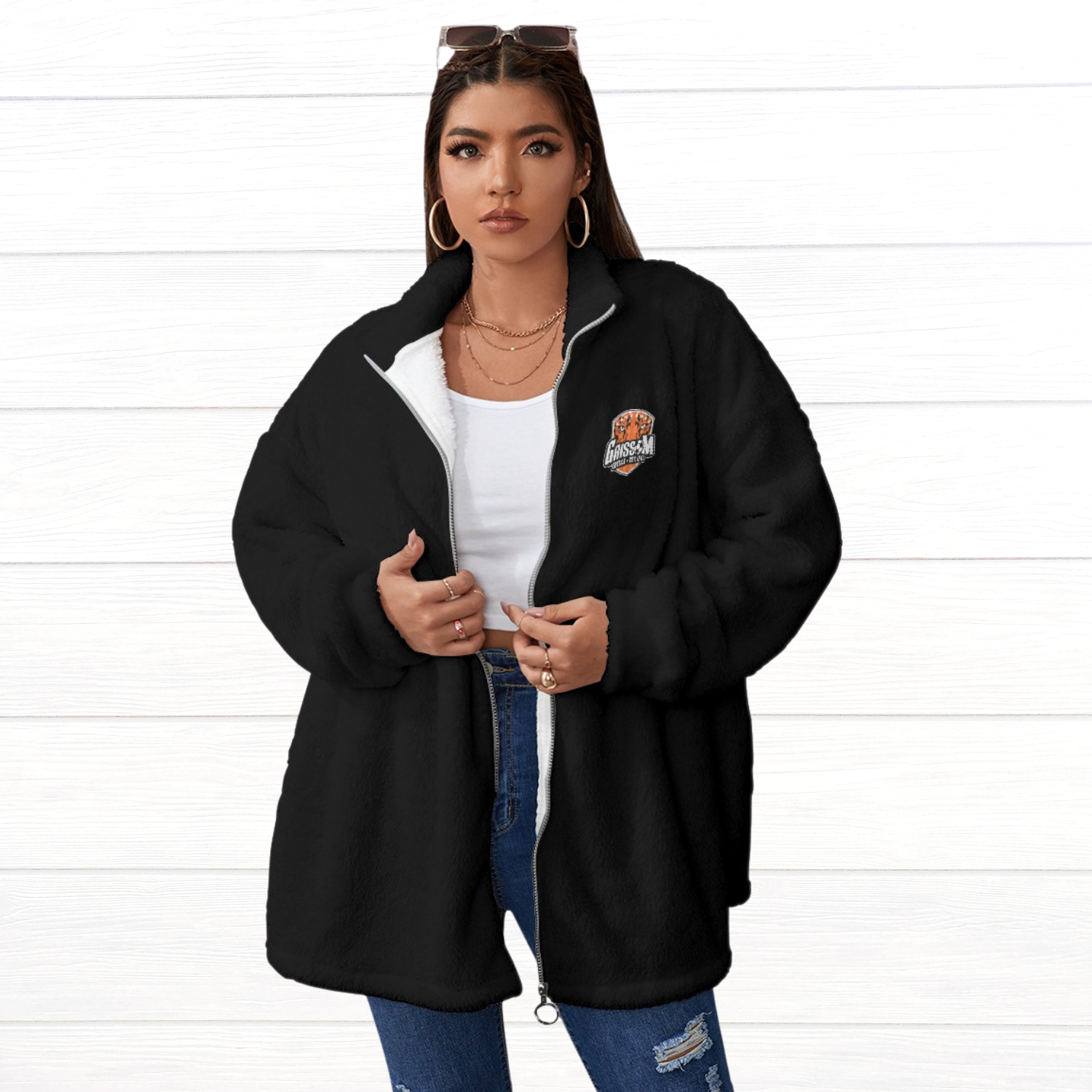 - Stand-up collar, long sleeve, zipper closure